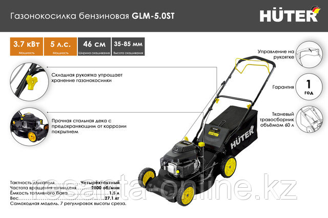 Газонокосилка бензиновая HUTER GLM-5.0ST используется для стрижки газонов площадью до 1000 кв.м. Агрегат оснащен четырехтактным одноцилиндровым двигателем мощностью 5.0 л.с. В качестве топлива рекомендуется использовать бензин АИ-92, так бензокосилка прослужит долго. Благодаря ручке регулирования высоты среза, расположенной у заднего правого колеса газонокосилки, можно оперативно регулировать высоту среза в семи положениях от 25 до 75 мм.